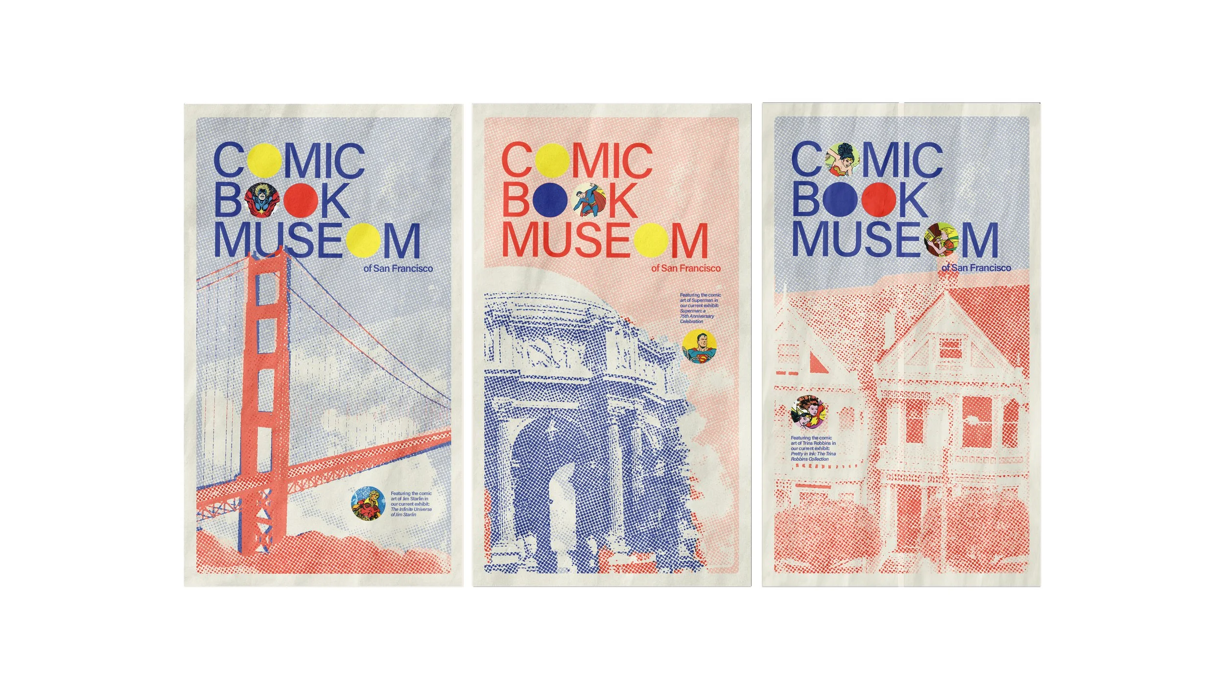 For this rebranding project, I chose to focus on select comic book motifs and incorporate them into the brand in a way that feels more contemporary. The logo identity itself was created initially to reference the familiar half-tone pattern that is so prevalent in comic arts. The ‘O’s are replaced with simple circles, which make this reference, but also symbolize an empty framework. The brand identity works revolve around this empty frame, which can remain flat colors or be replaced with imagery or patterns. These circles are much like the museum itself: a humble framework that lets the art inside take the spotlight.